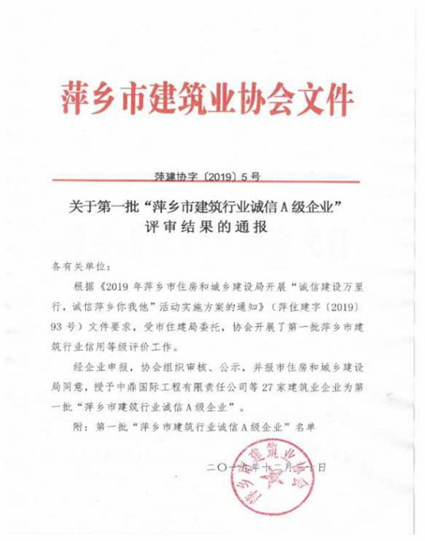 萍鄉(xiāng)市建筑業(yè)誠信等級A級企業(yè)